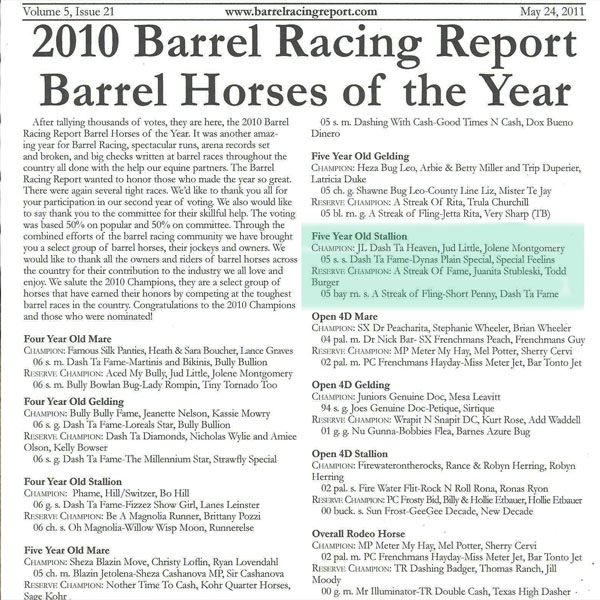 A STREAK OF FAME was named the 2010 Reserve 5 Year Old Barrel Stallion by committee and popular vote in Barrel Racing Report!!!!!!!!!!!